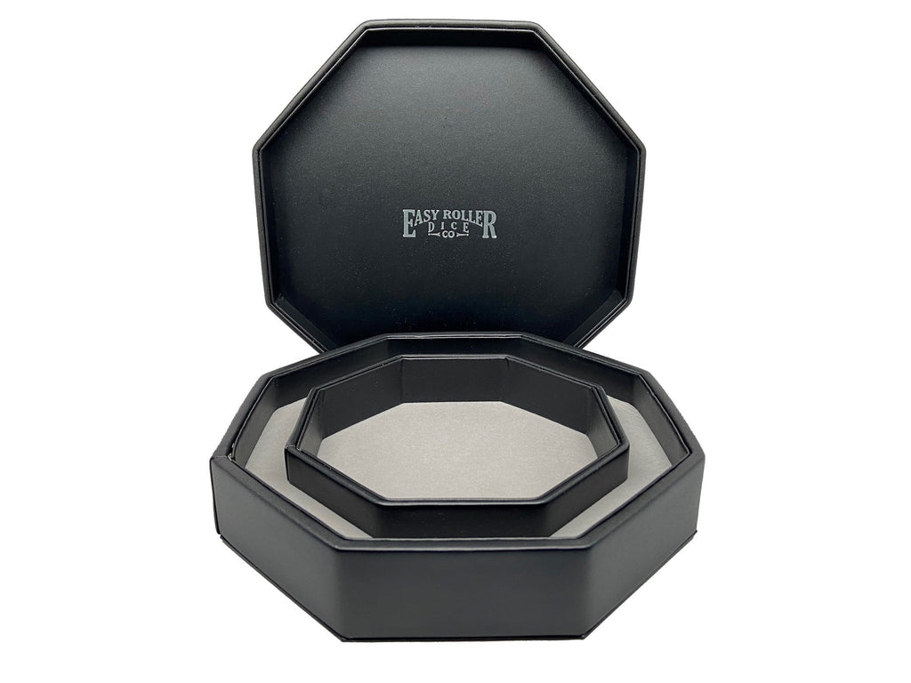 This regular 8 inch dice tray, but on this design, there is no design stamped on the lid. This tray keeps your dice out of the way of the rolling surface, and the lid makes clean-up and transport easy. The staging area provides a place to keep your dice without them getting in the way of the rolling space. The tray and the lid are wrapped in high quality leatherette, and the dice staging area along with the rolling surface are both covered in velvet.