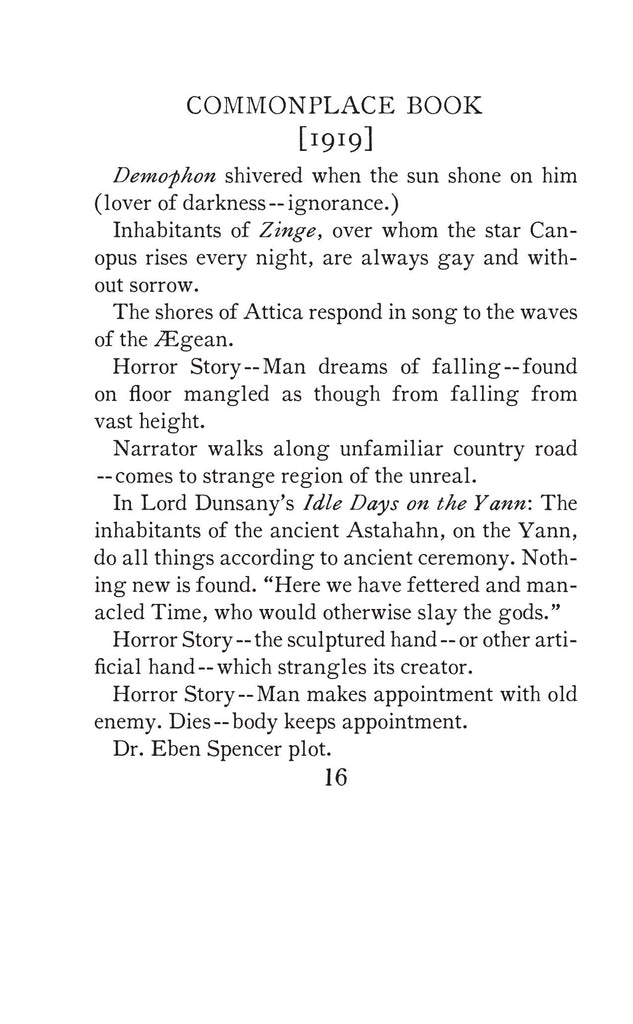 During his lifetime, HPL kept a listing of story ideas, concepts, and other elements which he might at some point include in his stories. He called this his "commonplace book". In 1938, just after HPL's death, his friend and literary executor, Robert H. Barlow printed HPL's commonplace book in an edition of just 75 copies. We thought it was high time for a new edition of the Commonplace Book, and here it is.