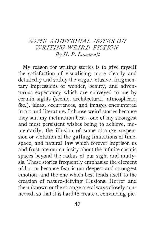 Working from high resolution photos of an original in the Library of Congress, we've created a typographic replica of the 1938 edition. To make it even more fun, we've also included materials Lovecraft wrote after he gave his manuscript to Barlow and which were not included in the 1938 edition. HPL also wrote plot summaries for more than fifty classic horror stories which were similarly omitted and are reproduced here for the first time. This volume also features an Afterword by Sean Branney and Andrew Leman of the H.P. Lovecraft Historical Society.