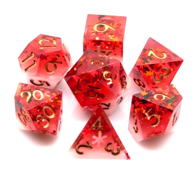 - Sharp Resin Dice featuring red translucent color on white opaque color and gold numbers. Inclusion is a festive holiday foil.