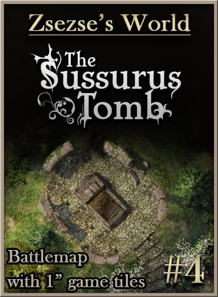 The map of the Sussurus Tomb shows a stone circle with a tomb in its center near a cobblestone road. Beneath the tomb is the beginning level of a huge set of catacombs.