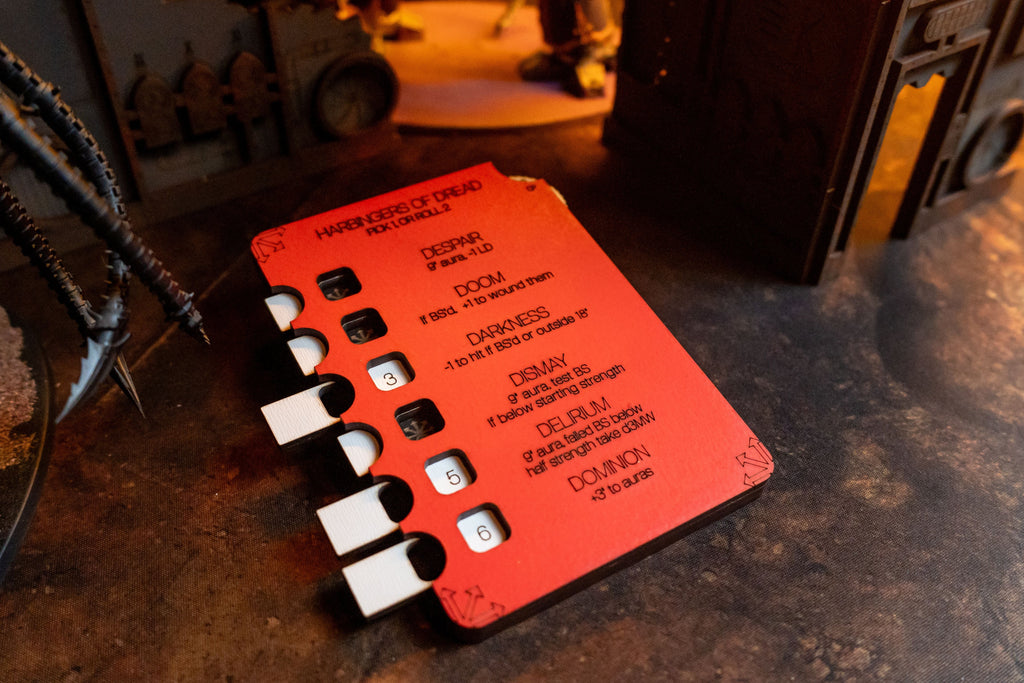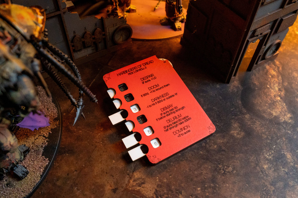 Chaos Knights don't just destroy their enemies—they break their spirits first. The Harbingers of Dread abilities represent this psychological warfare, and this tracker makes those terror effects visceral and visible. When you activate a Harbinger ability, you flip the physical switch with a satisfying click. Your opponent sees the indicator change and knows their units are now suffering from supernatural dread.