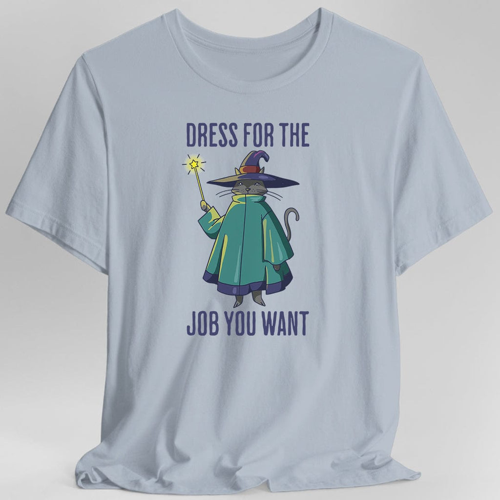 Because sometimes the job you want is "full-time wizard." This playful Dress For The Job You Want T-Shirt features a serious-looking cat dressed in robes, hat, and holding a magical staff, reminding us all to show up in style for the role we dream of.