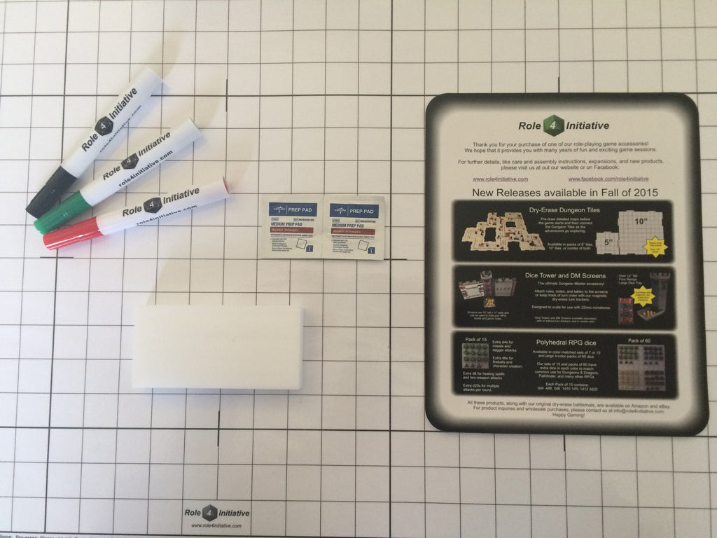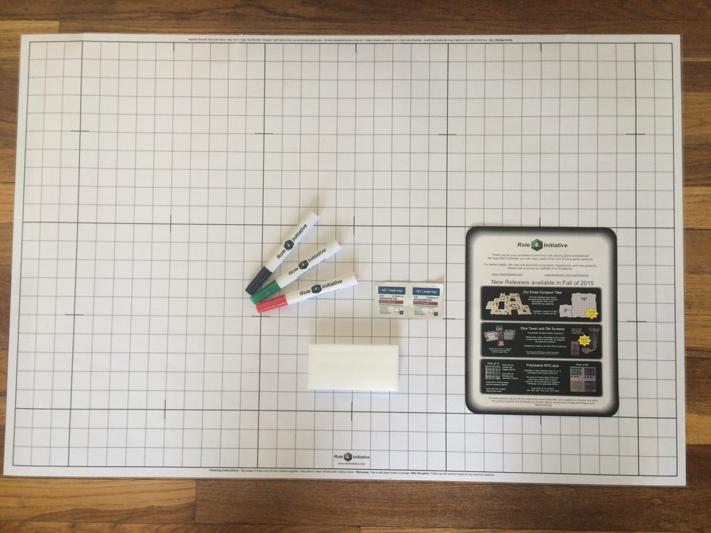 Included with the mat are three different colored dry-erase markers and one eraser. Use a different color to draw walls, doors, stairs, area affects from spells, etc. Also included is a set of instructions for use, care, and maintenance and a set of cleaning wipes. Please note that the surfaces of these mats are intended to hold dry-erase ink better than a typical whiteboard so that your drawings will be more resistant to the movement of minis or a casual finger swipe. This also means that the mat is slightly more resistant to intended erasing, but with the included eraser and care instructions, all markings should clean right off.