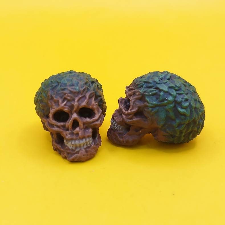 Miniature forest skulls made to look like they are covered in branches and leaves. These beautiful skulls make an interesting and unique addition to your 6 inch (1:12) and 7 inch (1:10) scale dioramas, dollhouses, terrariums, and action figure photography. Also fun for Halloween, tabletop games, and board game tokens.