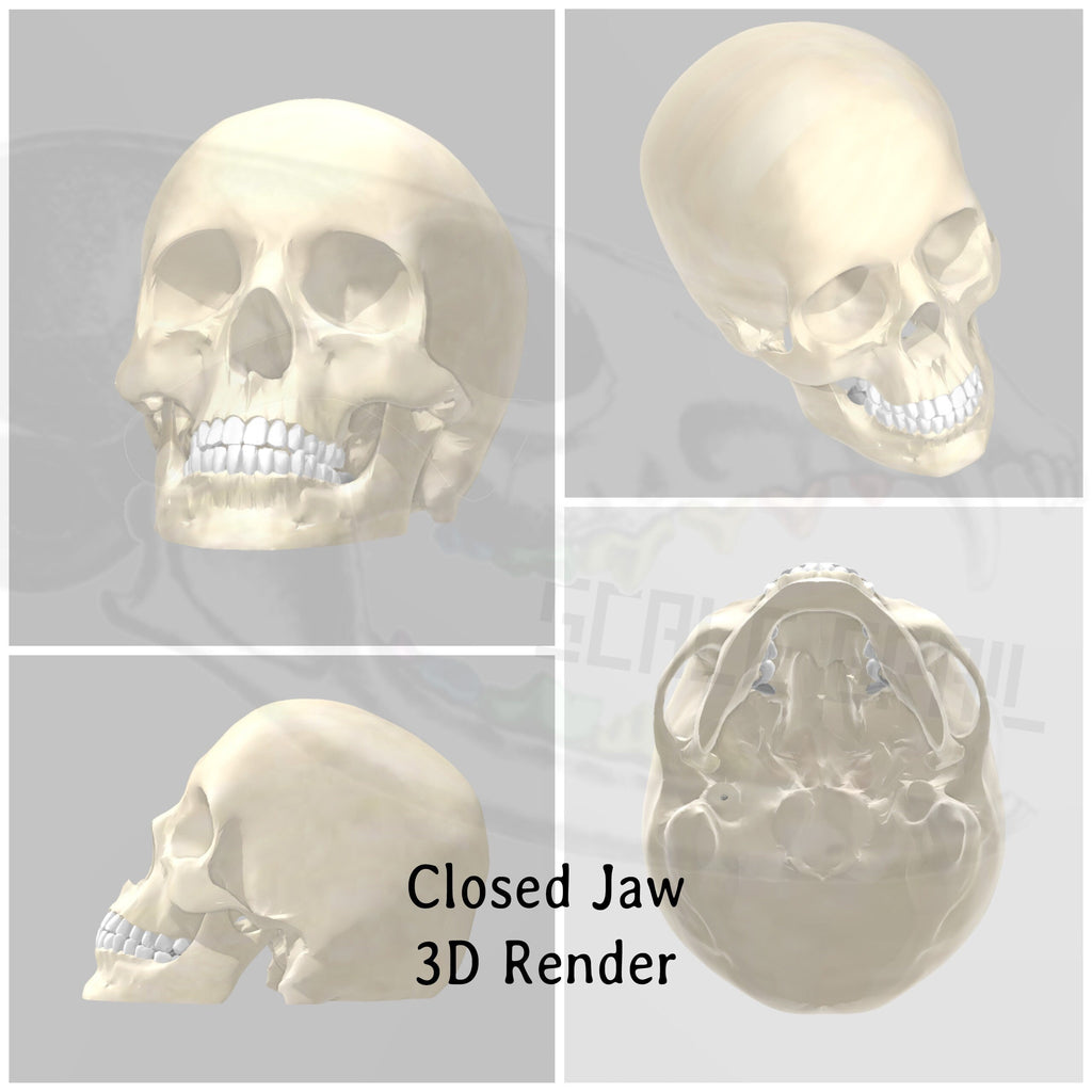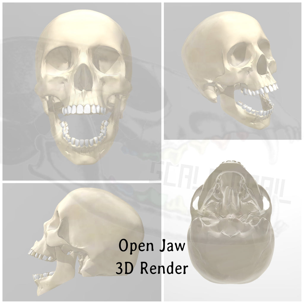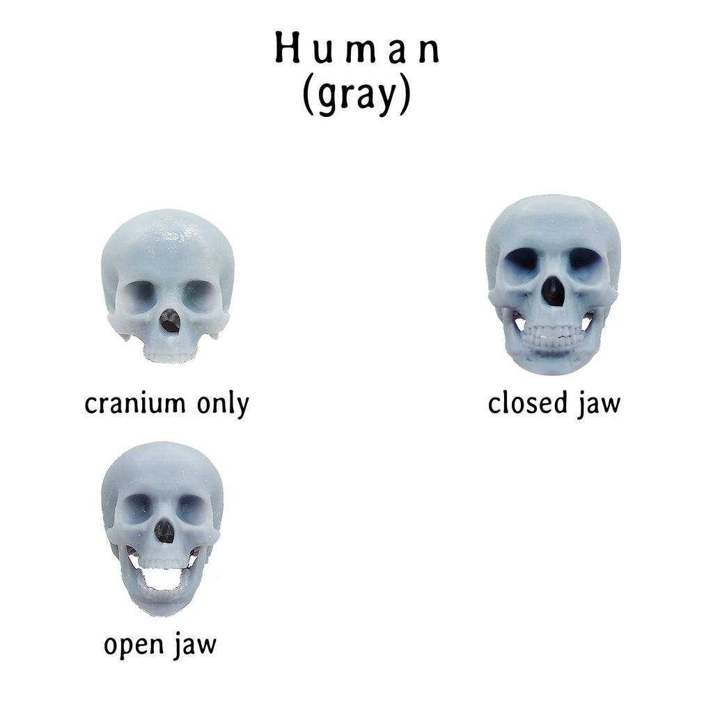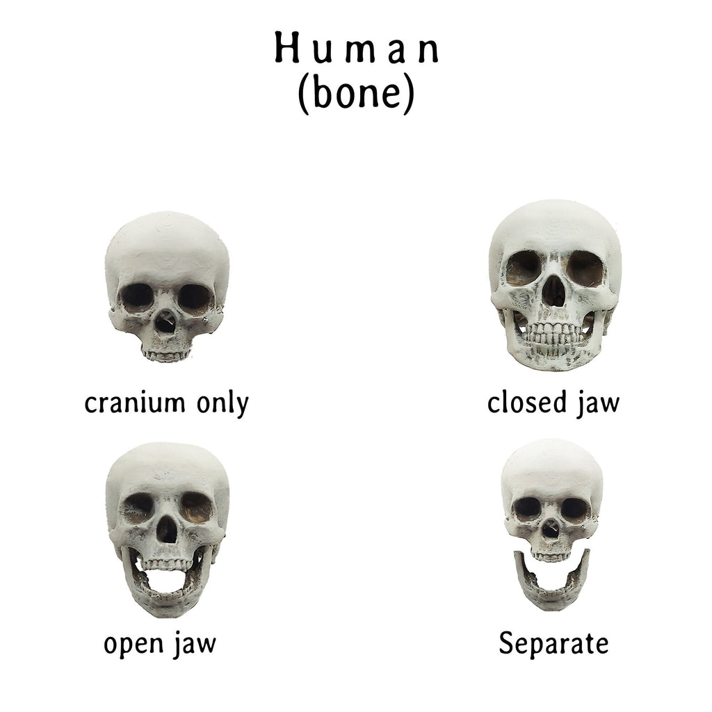 Miniature Human skulls, cranium and bottom mandible in closed, open, or just top cranium style. The jaws are fixed permanently and the skulls are solid. These tiny skull heads are great for use with DIY crafts, dollhouse accessories, diorama building, dice making, resin add ins, epoxy extras, small horror props for Halloween, and any art project you are working on!