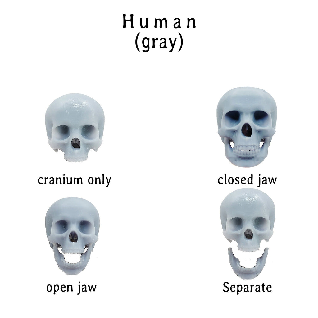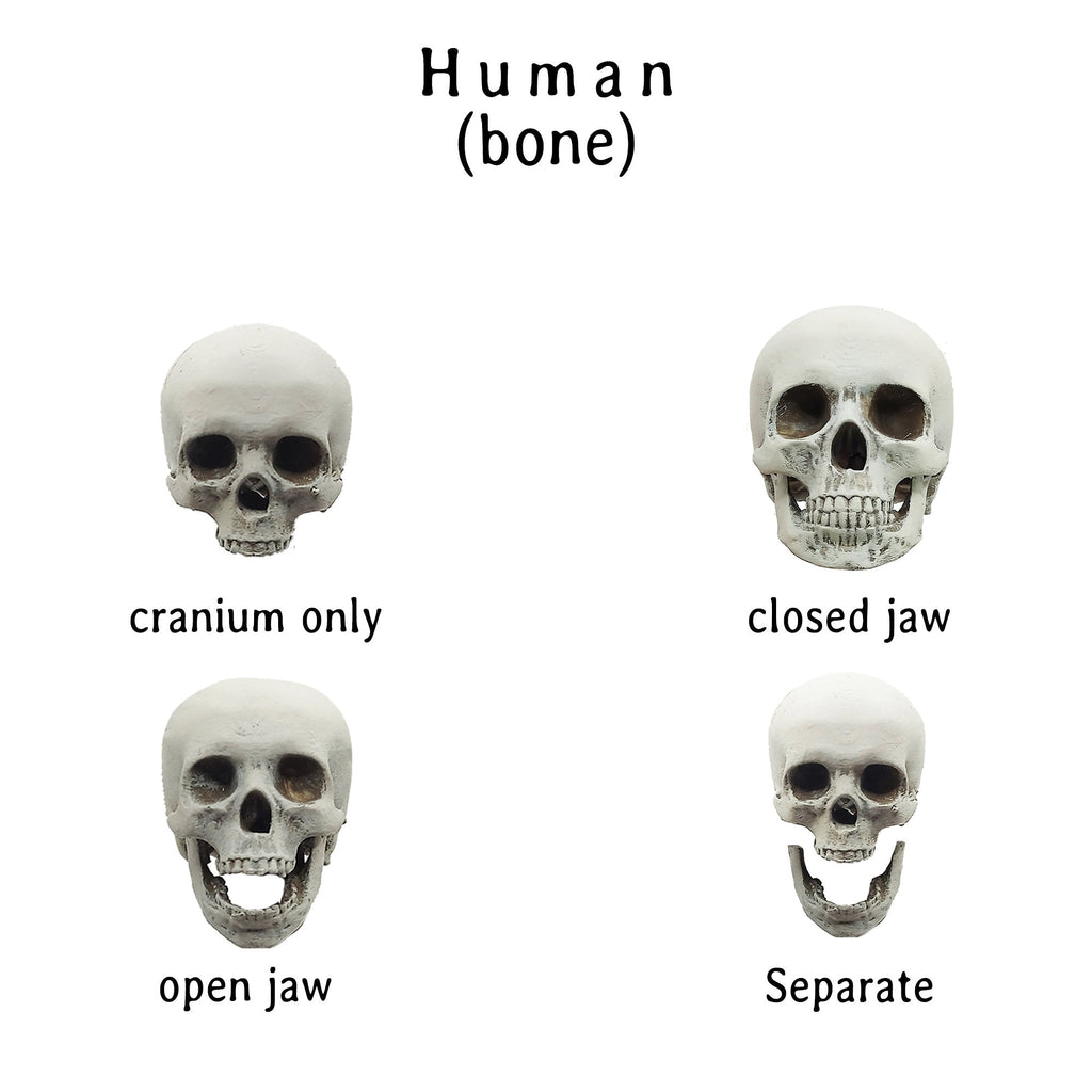 Miniature Human skull, cranium and bottom mandible in closed, open, separate, or just top cranium style. The jaws are fixed permanently and the skulls are solid. These small skull heads are great for use with DIY crafts, dollhouse accessories, diorama building, action figures supplies, small horror props for Halloween, home decor, curio cabinets, and any art project you are working on!