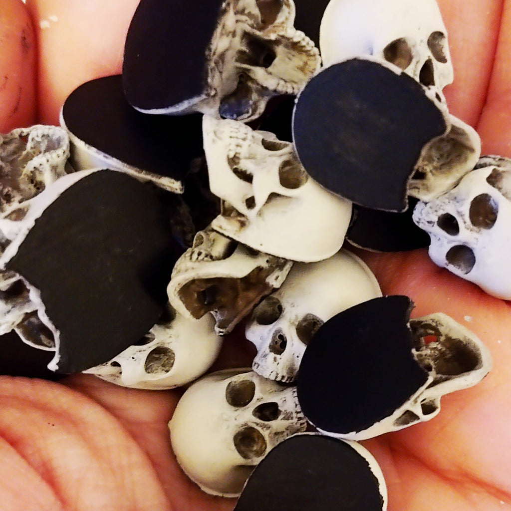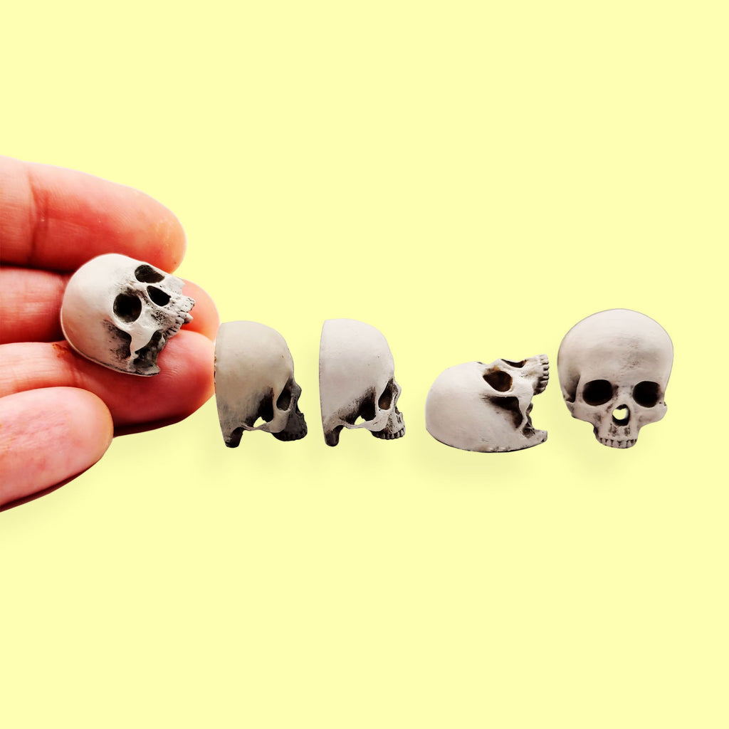 Realistically detailed human skulls with flattened backs. Will look great in your diorama, dollhouse, curio cabinet, terrarium, or other arts and crafts projects.