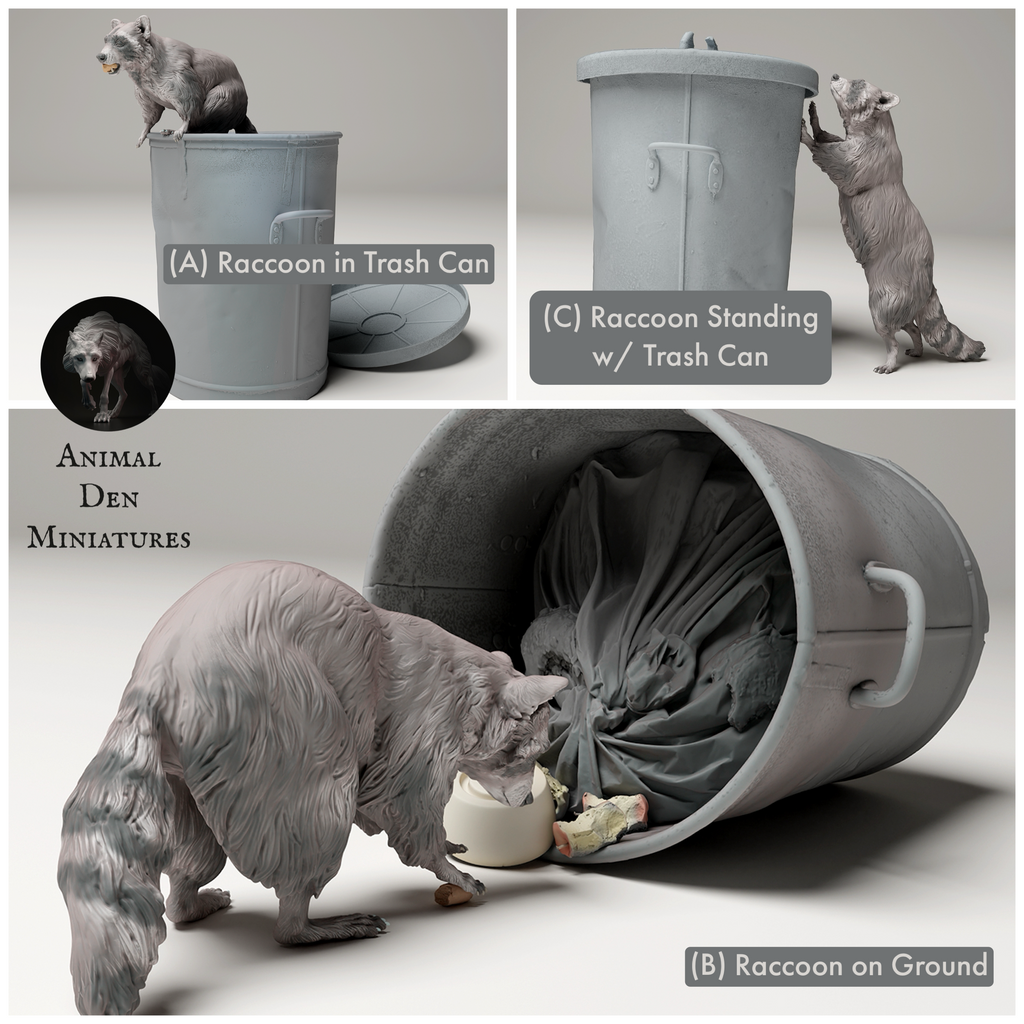 These raccoon models are perfect for painting and display in your miniature dollhouse or diorama! Features choice of raccoon each with their own trash can! Please note images are digital renders. Your model will be in an unpainted gray color or hand painted if applicable.