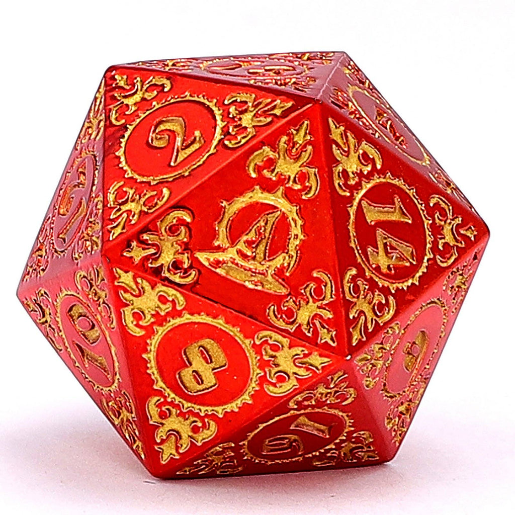 Flame Conjurer: Our Wizard Metal dice set blazes with the power of elemental fire. Each of the seven polyhedral dice features a vibrant crimson finish adorned with ornate gold arcane sigils, runes, and mystical emblems that catch the light with every roll. The striking contrast between the rich red background and gleaming gold numerals ensures perfect readability even in dim candlelight. Perfectly balanced and satisfyingly weighty, these dice deliver consistent results whether you're casting a simple cantrip or unleashing that 9th-level spell you've been saving. They're the perfect companion for pyromancers, evocation specialists, or any spellcaster who appreciates that true magic requires both precision and flair.