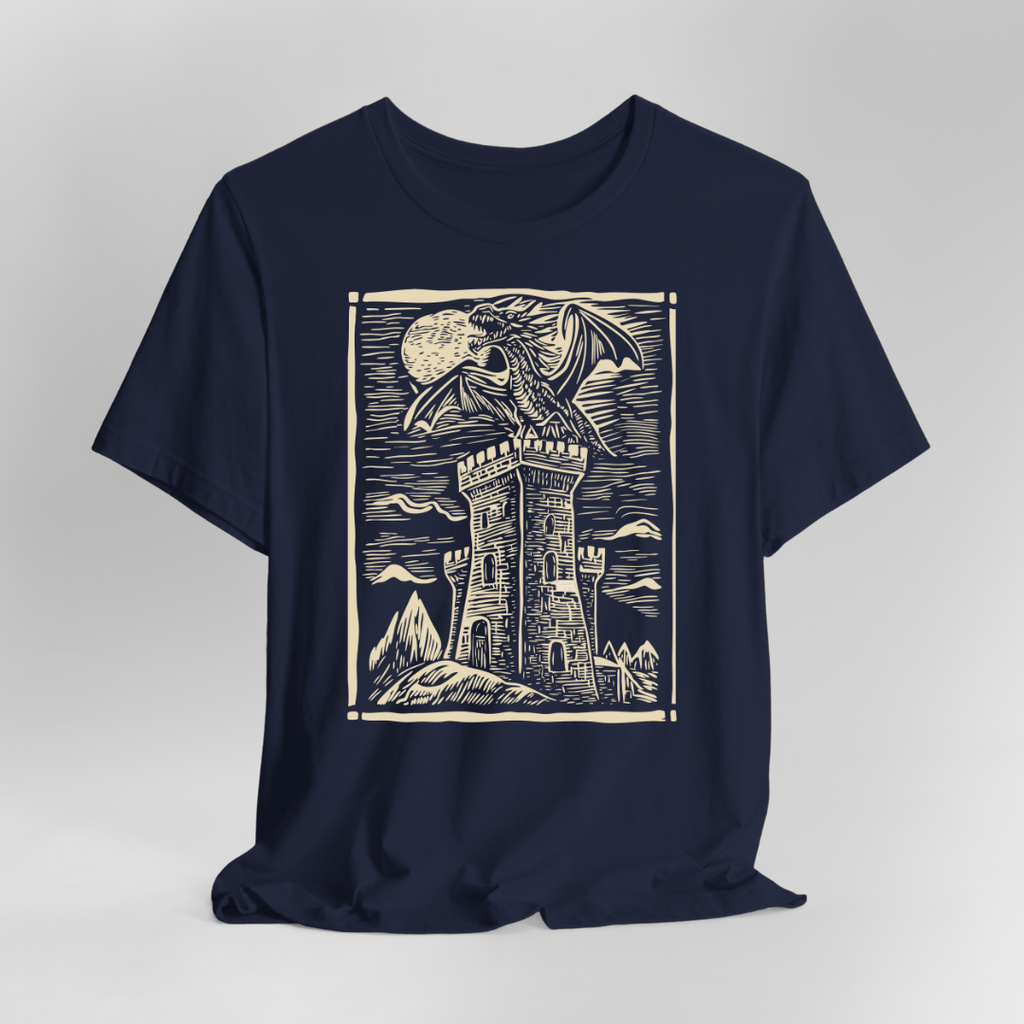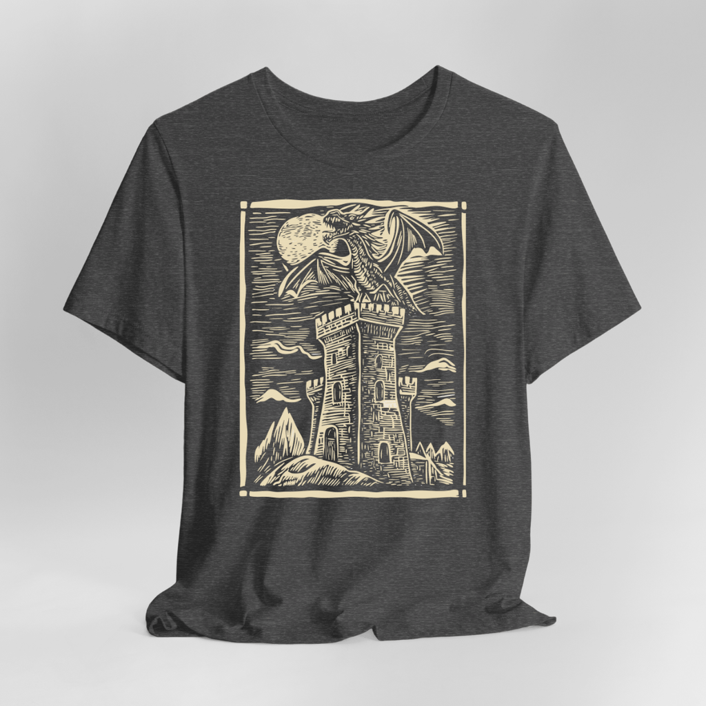 Unleash your inner adventurer with this vintage-inspired dragon shirt, featuring a bold, woodcut-style print of a fearsome dragon perched atop a towering castle under the moonlight. The intricate detailing and old-world charm capture the spirit of medieval fantasy, making it the perfect statement piece for fans of epic quests, tabletop gaming, or just anyone who loves unique, eye-catching designs. Crafted from soft, high-quality fabric, this tee is as comfortable as it is captivating—perfect for adding a touch of legendary style to your everyday wardrobe.