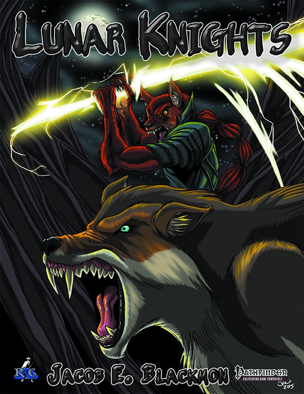 Lunar Knights presents a world of shapeshifting options, from campaign options on how to handle lycanthropic curses, variant lycanthropes based on various mythologies, new shapeshifting-themed class features (ranging from the barbarian’s lycanthropic stalker to a sorcerous lycanthropic bloodline), new feats, new forms of lycanthropy, and even lycanthropy-specific prestige classes—including the dire lord, moon priest, and even the lunar knight!
