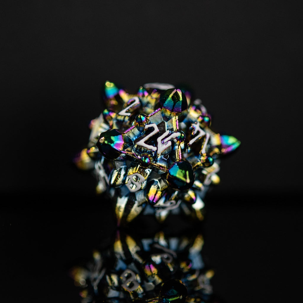 Our metal dice sets are all cast from zinc alloy metal to assure better balanced rolls. This set is perfect for any RPG and will be sure to impress at your upcoming session! Every set comes with its own metal dice tin for easy storage and a winning presentation.