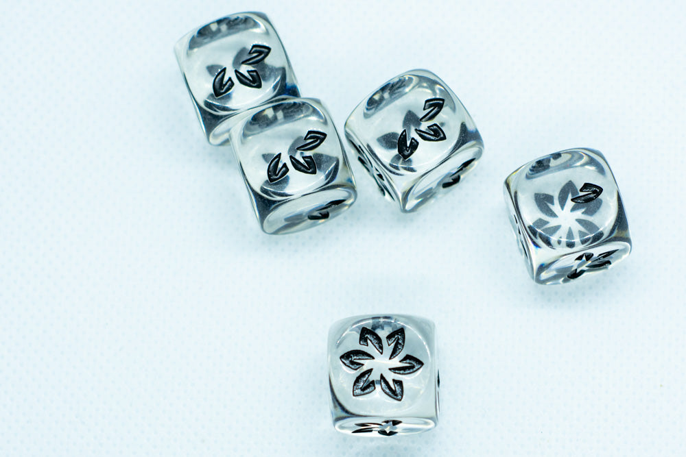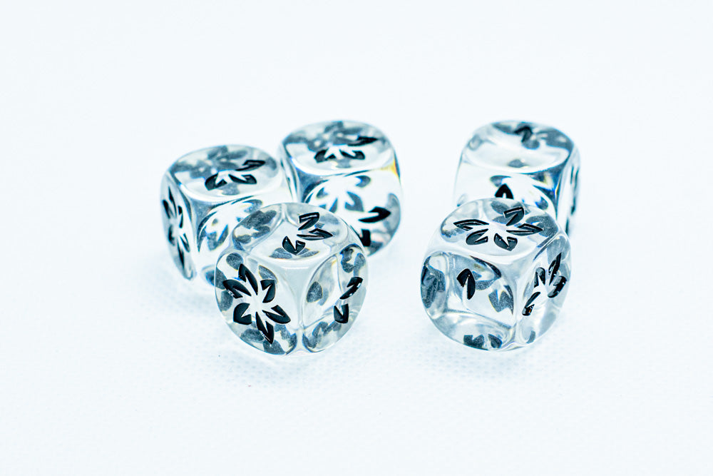 - Color is clear d6 with black petals.