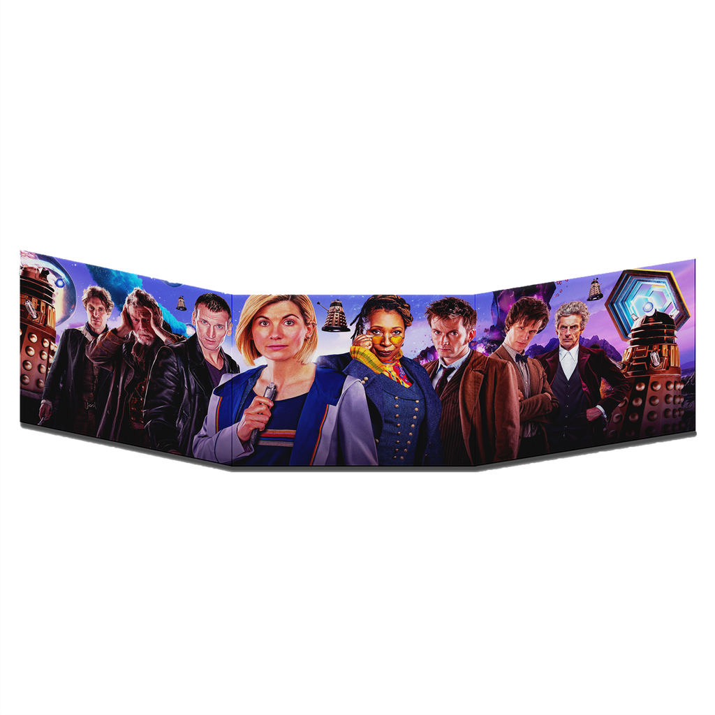 The Gamemaster’s Screen is a three-panel landscape screen with a stunning image of the Doctor’s recent incarnations, which will inspire your players to ask themselves, ‘What would the Doctor do?’ The interior contains the most used rules and tables, handy for both novice and seasoned Gamemasters to refer to in the middle of an epic adventure without slowing things down.