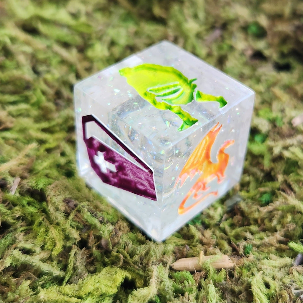 This 20mm oversized D6 features a different iconic monster or creature on each face: Giant, Dragon, Mimic, Gelatinous Cube, Owlbear, and Vampire/Undead. Each image is inked in white base acrylic paint with complementary colors painted over for a vibrant, eye-catching appearance. Perfect for Dungeon Masters who love random encounters!