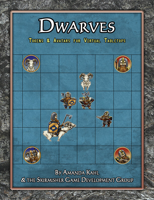 This set of 20 full-color tokens and avatars/character portraits by fantasy artist Amanda Kahl contains two variations on five different figures, a Champion with great ax, Infantryman with battle ax and shield, Crossbowman, War Goat, and Cavalryman mounted on War Goat! One variation has red markings and circular devices on their shields, while the other has blue markings and diamond-shaped devices, and these alternate versions can be used to easily reflect different factions, levels, and/or capabilities.