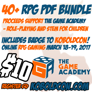 Want to get some great LOOT and support a fantastic cause at the same time? Grab this bundle of over 40 VERY POPULAR PDFs and you will be helping to support kids learning social interaction through role-playing games! The Game Academy, KoboldCon, and the Open Gaming Store have teamed up to offer this fantastic bundle for just $10! The best part?