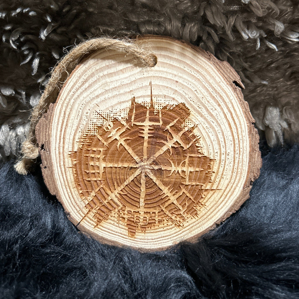 The Vegvisir, whose name means "that which shows the way," is an Icelandic magical stave intended to help the bearer find their way through rough weather and not lose their path. When you display this piece, you're connecting with centuries of Norse tradition and the Viking spirit of exploration and resilience. The natural wood slice adds organic beauty to your space, with each piece telling its own story through unique grain patterns, knots, and bark texture. It serves as both a beautiful decoration and a daily reminder to stay true to your path, no matter what storms you face.
