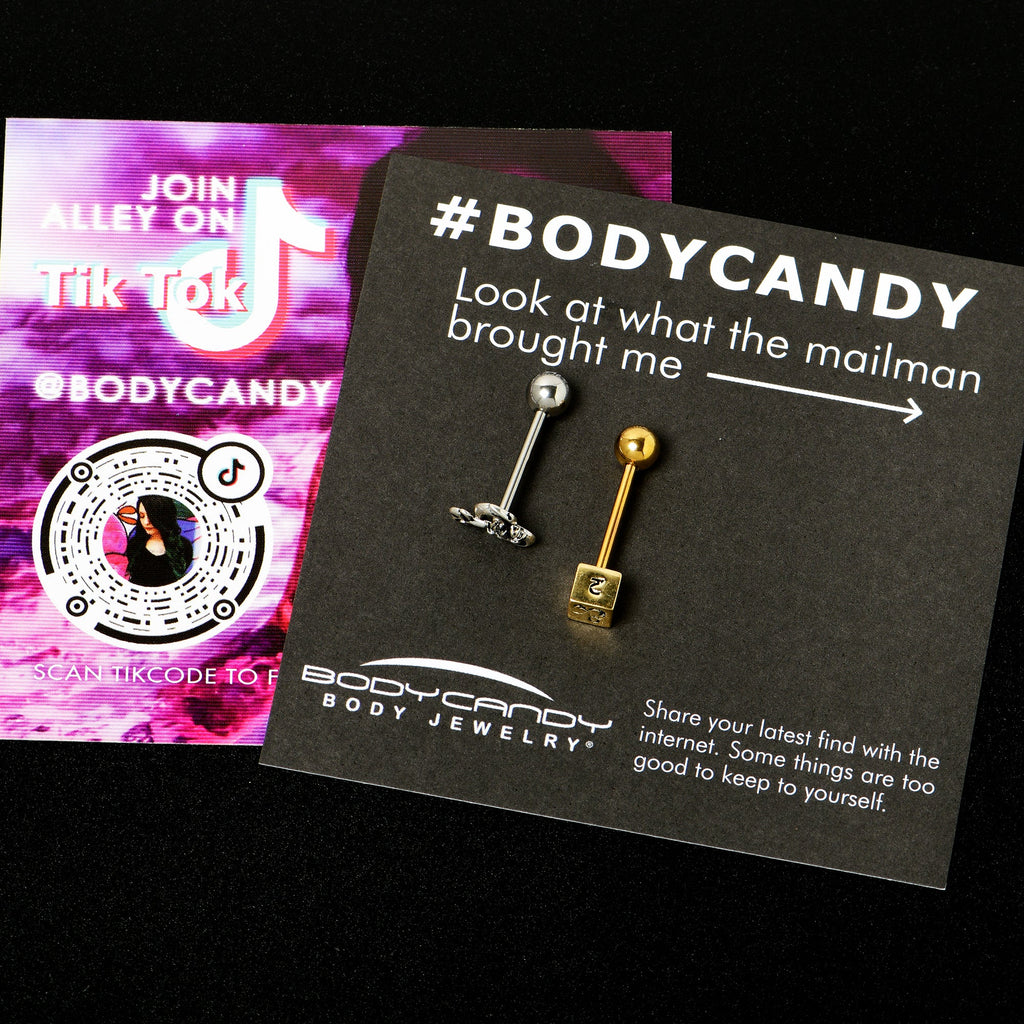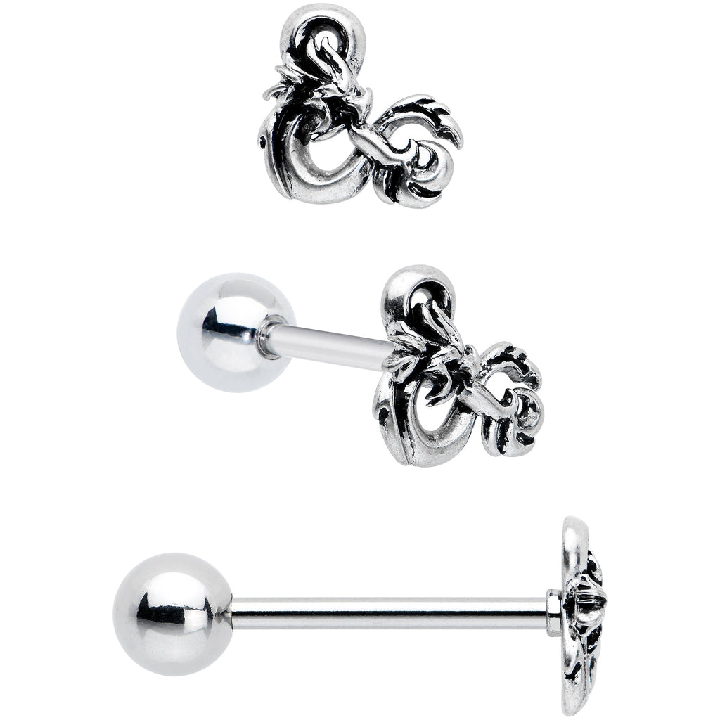 No need to roll for style points when you're rocking these 14 gauge tongue piercing rings! These officially licensed Dungeons and Dragons tongue barbells are 5/8". One is made with a 316L surgical grade stainless steel straight barbell with 6mm bottom ball ends. The top end features a highly detailed official D&D ampersand. The other is made with a gold tone PVD over 316L surgical grade stainless steel straight barbell with a 6mm bottom ball end. It features a dice charm top end with the official D&D ampersand. You'll be ready to slay any dragon when you're rocking these Dungeons & Dragons tongue rings! Sold as a set of two.