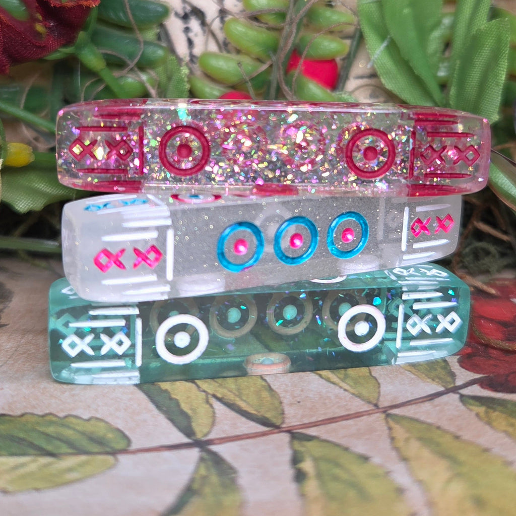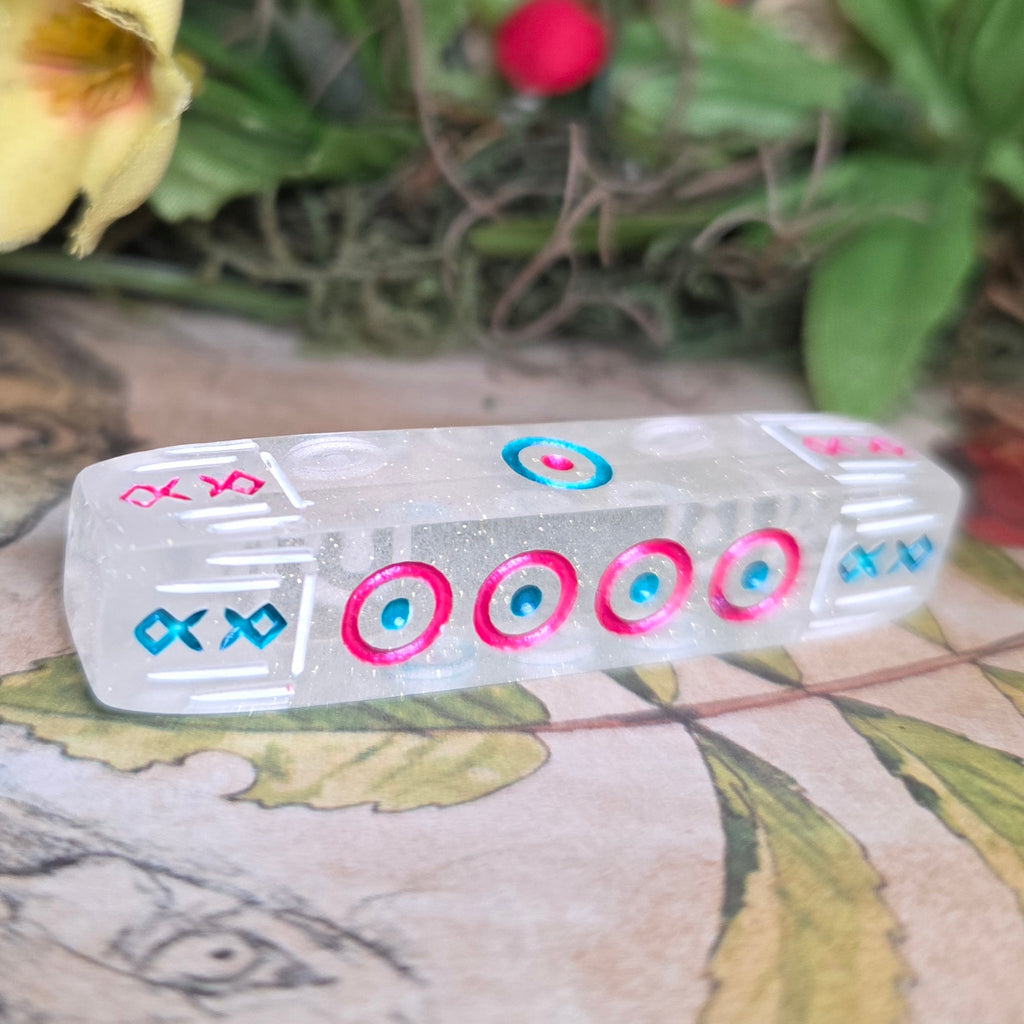 This alternative-shaped D4 is based on historical dice designs, featuring a lightweight 'bar' style with a slight curve. The pipped design uses dots instead of numbers, just like ancient dice! Polished to a glass-like finish and inked in unique rainbow colorshift acrylic paint that changes color as you view it from different angles.