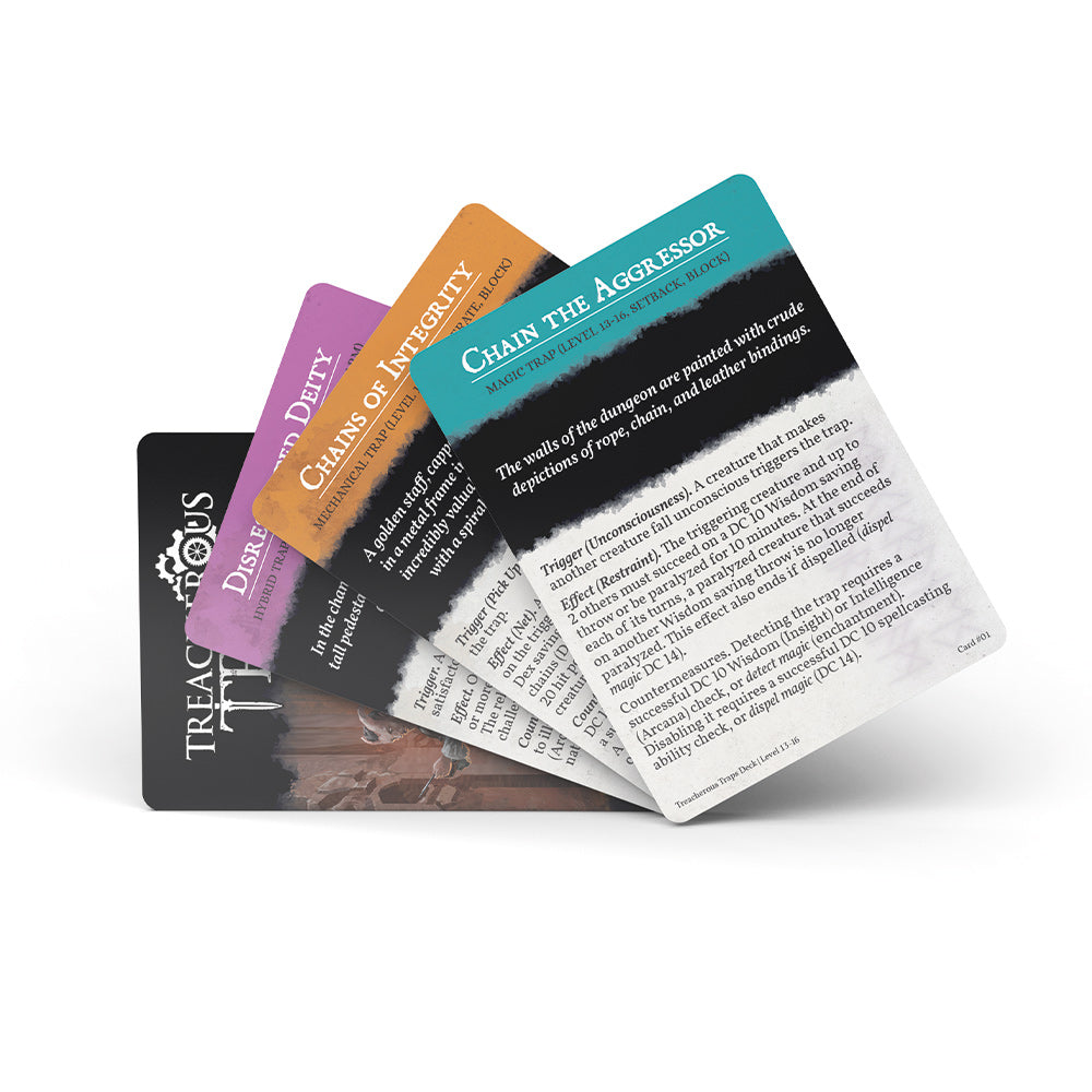 Save time while prepping or grab traps on the fly! Inside you’ll find 50 premade trap cards to challenge your level 13-16 party, ranging from minor setbacks to deadly threats.
