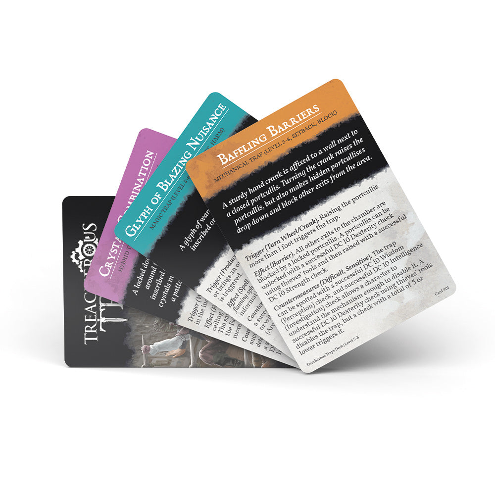 Save time while prepping or grab traps on the fly! Inside you'll find 50 premade trap cards to challenge your level 5-8 party, ranging from minor setbacks to deadly threats.