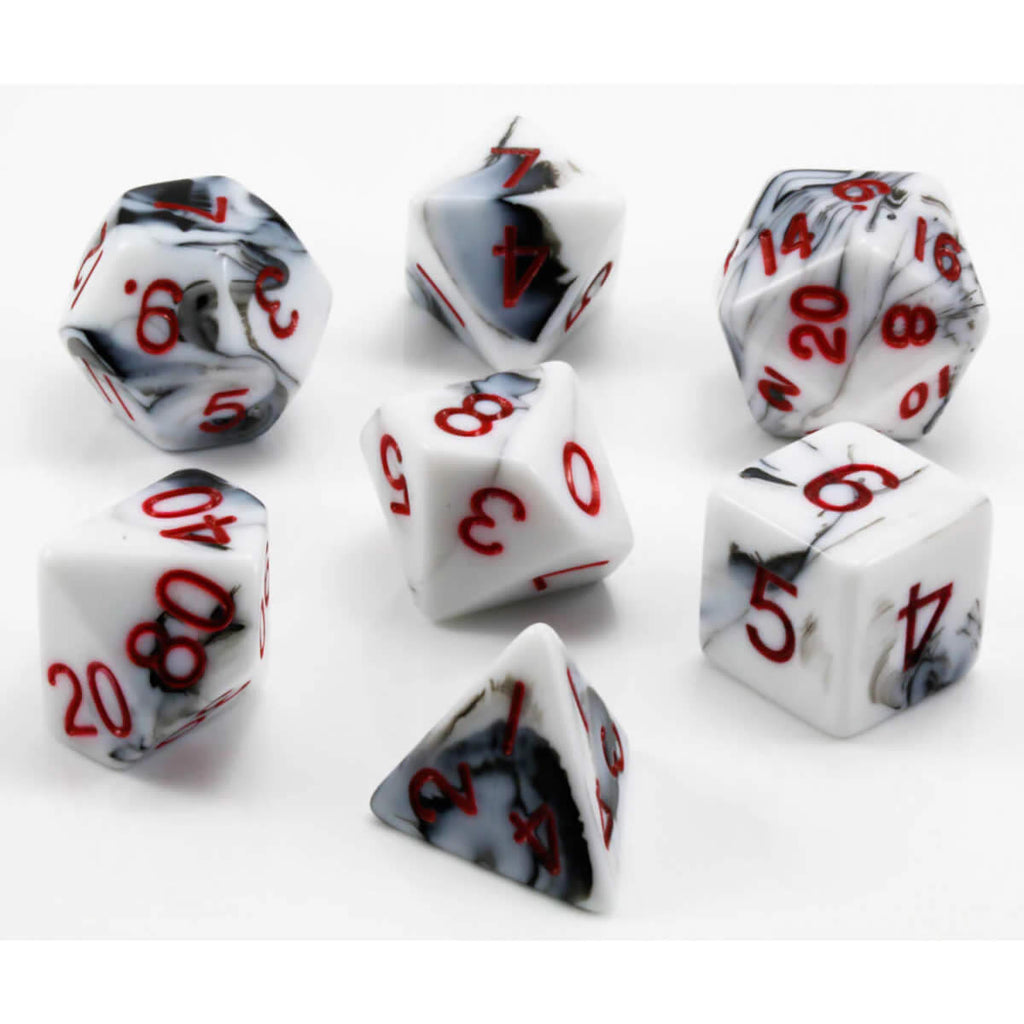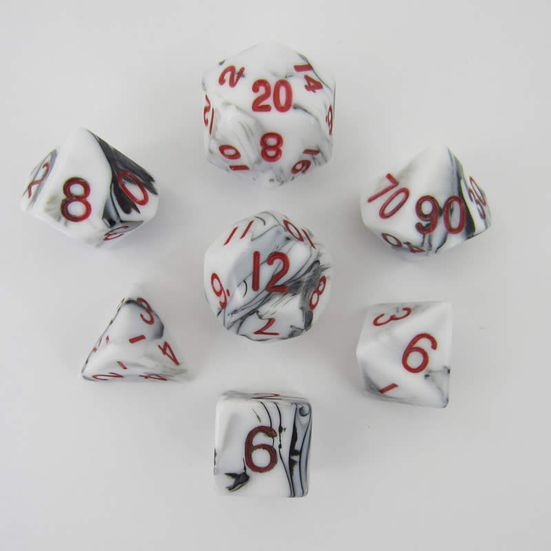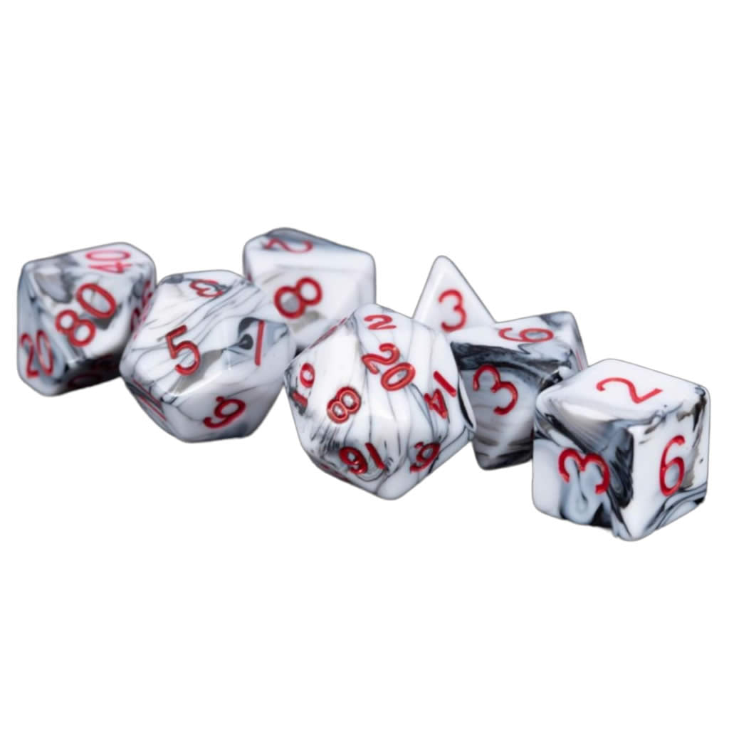 MET1031 Black and White Marble Acrylic Dice with Red Numbers 16mm (5/8in) Set of 7 Metallic Dice Games