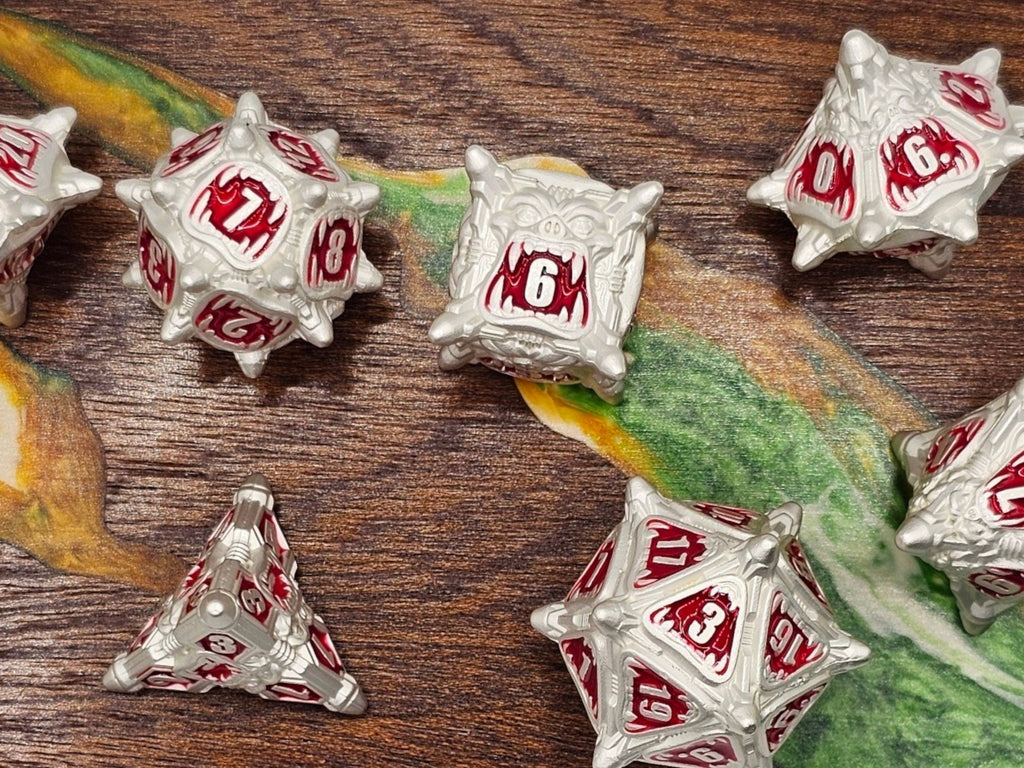 Channel the wrath of the Oni with this 7-piece metal RPG dice set, forged in the image of chaos and carnage. These dice don’t follow your standard shape—they’ve got an otherworldly edge, designed to look and feel like they were pulled from the depths of a demon’s lair.