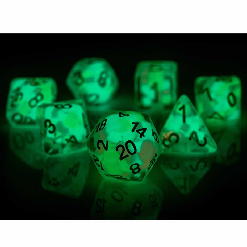 SDZ000605 Lucky Charm Glowworm Resin Dice with White Numbers 16mm (5/8 inch) 7 Dice Set
