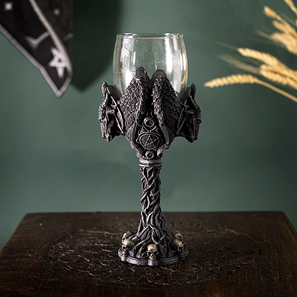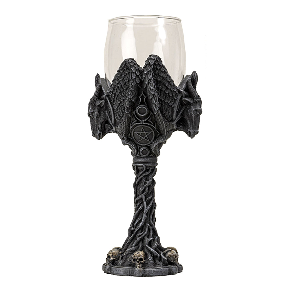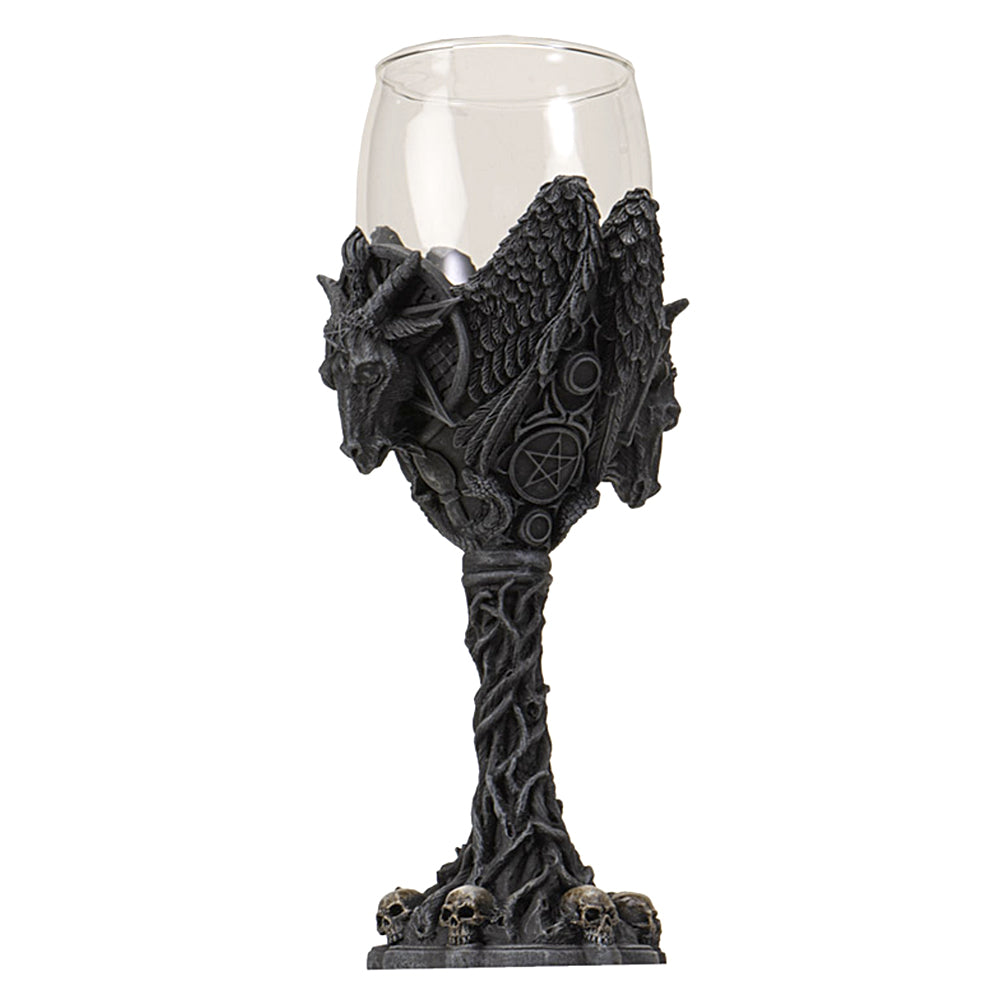 Baphomet contains binary elements symbolizing a reconciliation of opposites, emblematic of the willingness to embrace, and even celebrate differences across individuals. This wine goblet features the face of Baphomet with the base of the goblet sculpted with the pentagram star. The details of this wine goblet is immaculate.