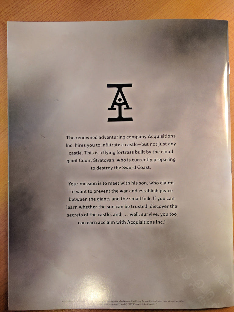 The renowned adventuring company Acquisitions Inc. hires you to infiltrate a castle--but not just any castle. This is a flying fortress built by the cloud giant Count Stratovan, who is currently preparing to destroy the Sword Coast.