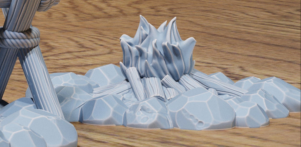 This Bandit Camp scatter terrain set includes two roaring campfires—one with a pig roast and the other with a cooking pot—plus a tribal banner and abandoned axe. A perfect mix of flavor and function for gritty tabletop RPGs like Pathfinder, DnD 5e, or Forbidden Lands.