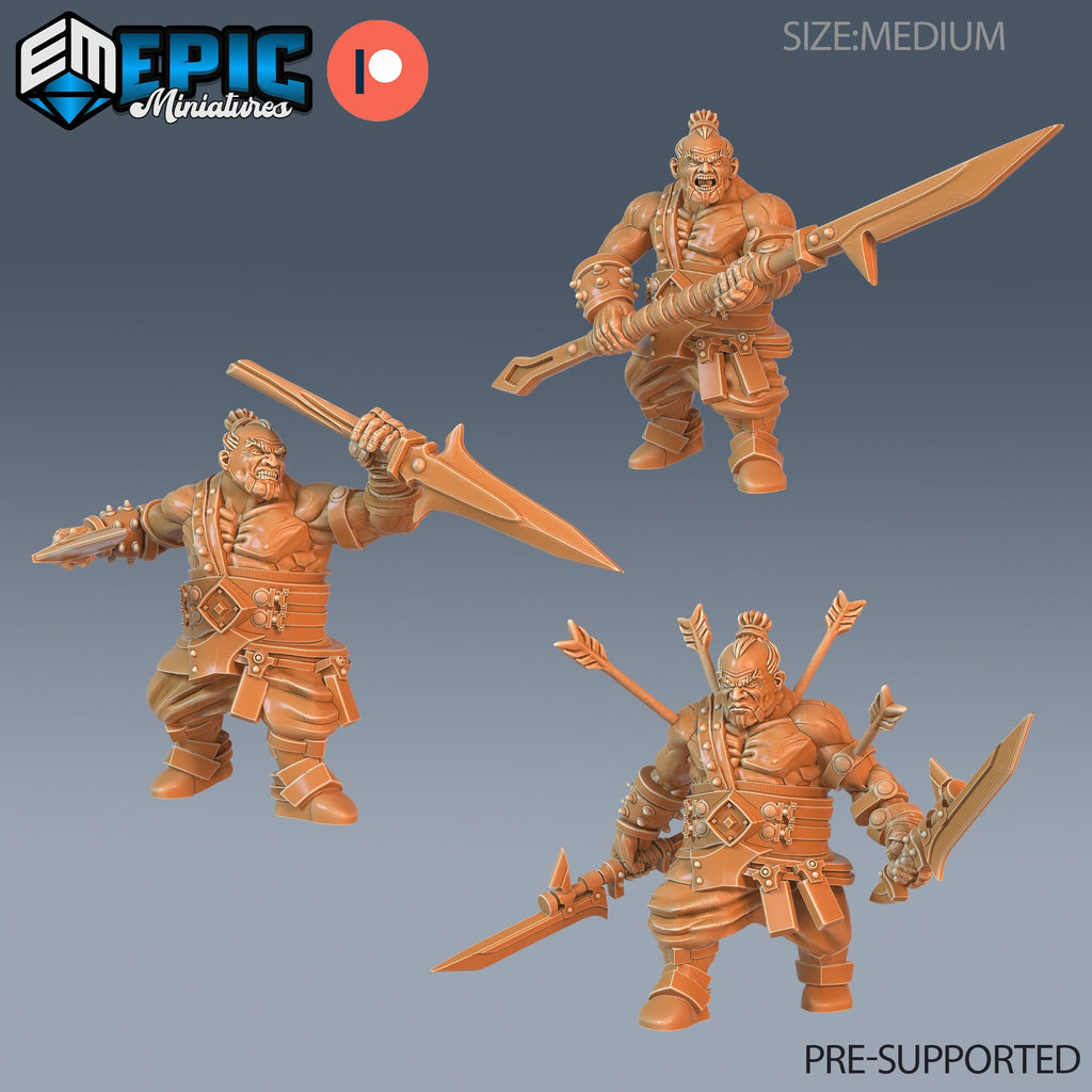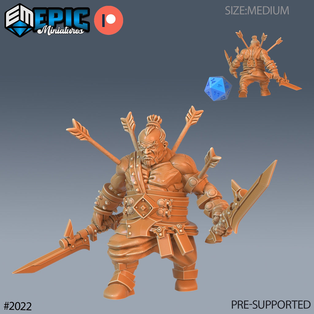This trio of male dwarf barbarians includes a raging spear-carrier, a dual-wielding brute, and a defiant veteran impaled with arrows. Perfect for Dungeons & Dragons, Pathfinder, or RuneQuest, these medium miniatures bring the fury of the mountains to any fantasy tabletop bloodbath.