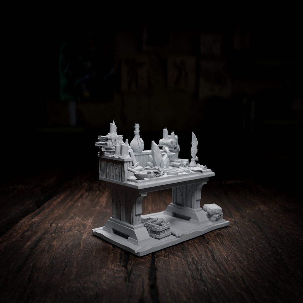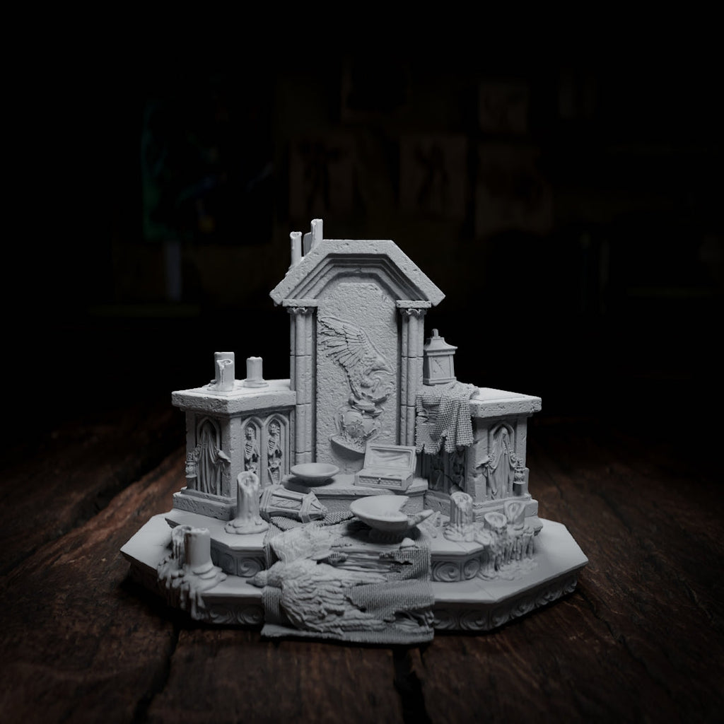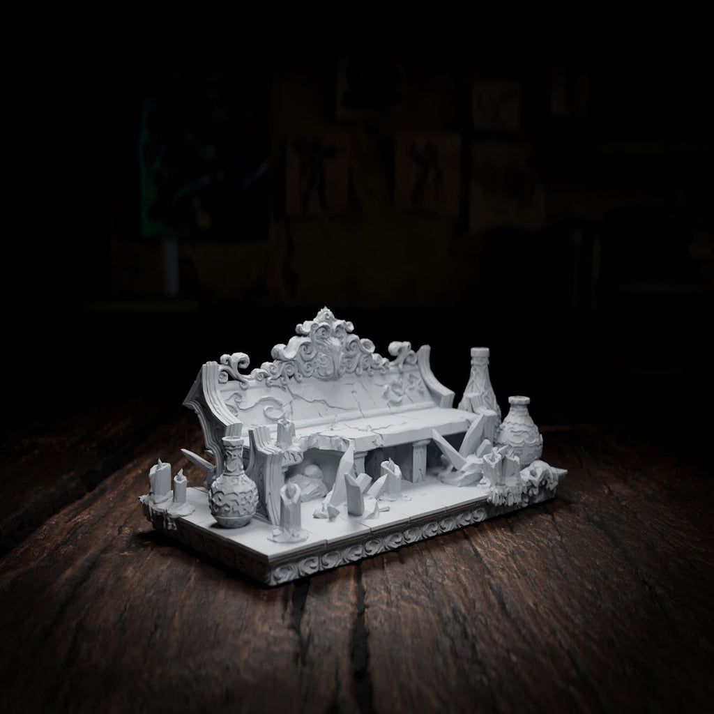 A grisly yet captivating collection of cultist-themed props from the Call of the Necromancer set. Featuring a hanging dead pig (yes, with guts on the floor), an alchemy table, and spooky furniture, these scatter pieces are perfect for dark fantasy TTRPGs like Dungeons & Dragons or Pathfinder.