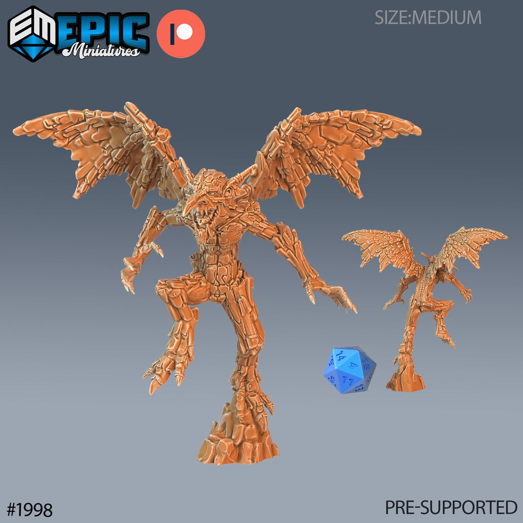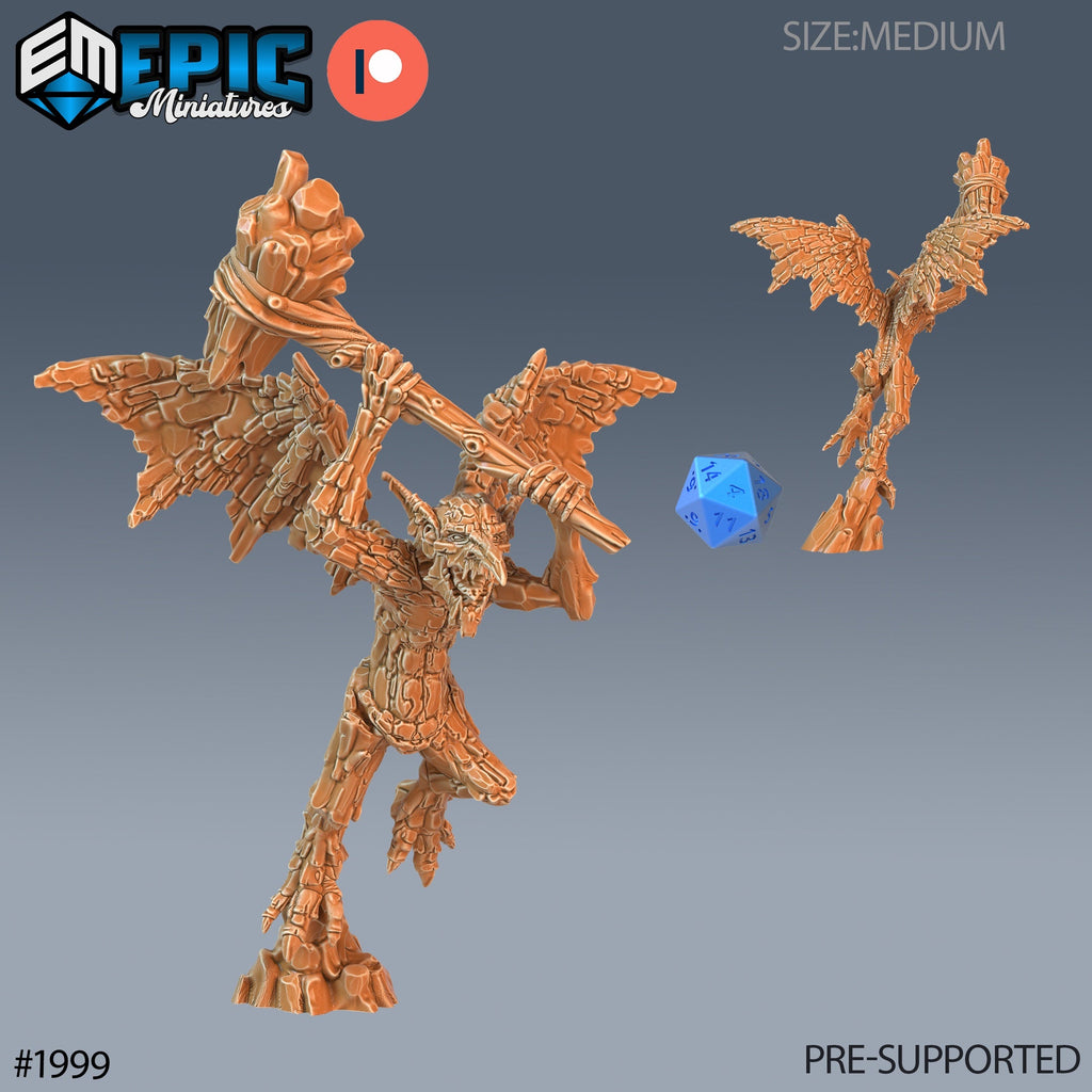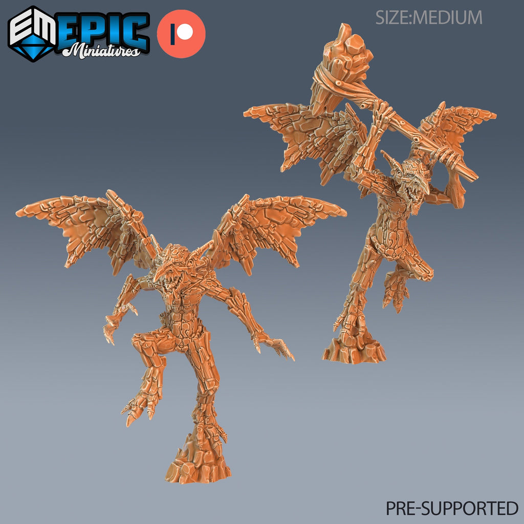 A set of medium-sized Earth Mephit miniatures, featuring winged rocky elementals in varied battle stances—one mid-flight and one wielding a stone hammer. Ideal for summoning chaos in your Dungeons & Dragons or Pathfinder campaigns, or adding rocky sass to your elemental encounters.