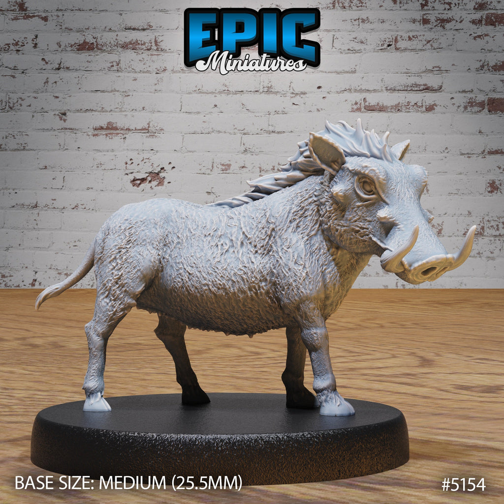 Warthog miniatures with bristled hides, tusks, and expressive poses, perfect for tabletop beasts, animal companions, or wild encounters in Dungeons & Dragons, Pathfinder, and other fantasy TTRPGs. Includes charging and alert poses on medium (25.5mm) bases.
