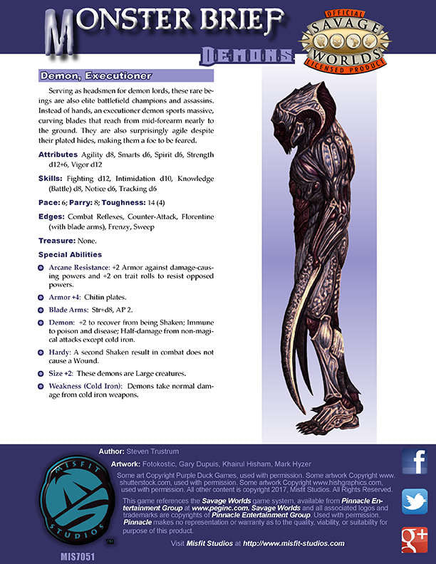 - The Executioner Demon, a naturally armored opponent with blades instead of forearms and hands. They are deadly combatants and tenacious foes.