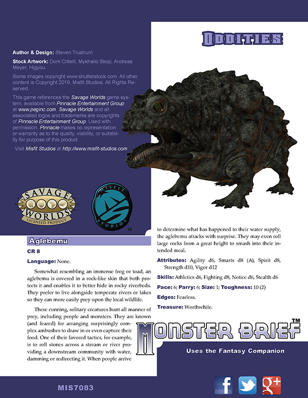 Create some trouble in your Savage Worlds game by including some encounters with new creatures that are a bit out of the ordinary and offer up the unexpected in Monster Brief: Oddities. In this product you will find: