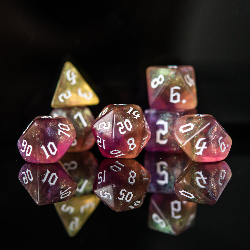Our acrylic dice are carefully poured into individual molds and cured inside a vacuum chamber to insure no air bubbles are trapped inside the dice. After curing, each individual die is removed from the mold and numbers are painted by hand. These dice are perfect for any RPG and will sure to impress at your upcoming session!