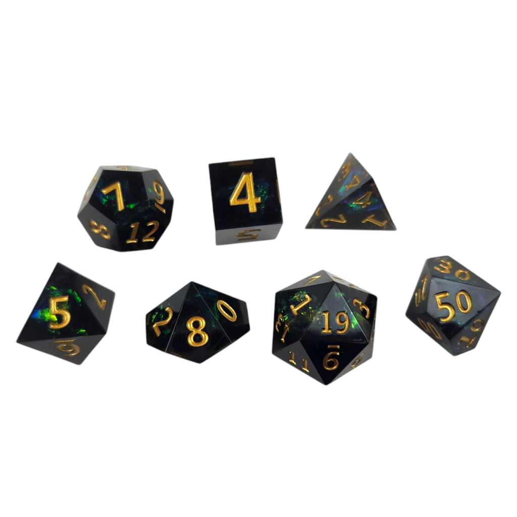 Set of seven sharp edged resin polyhedral dice- Black die with blue and green foil.