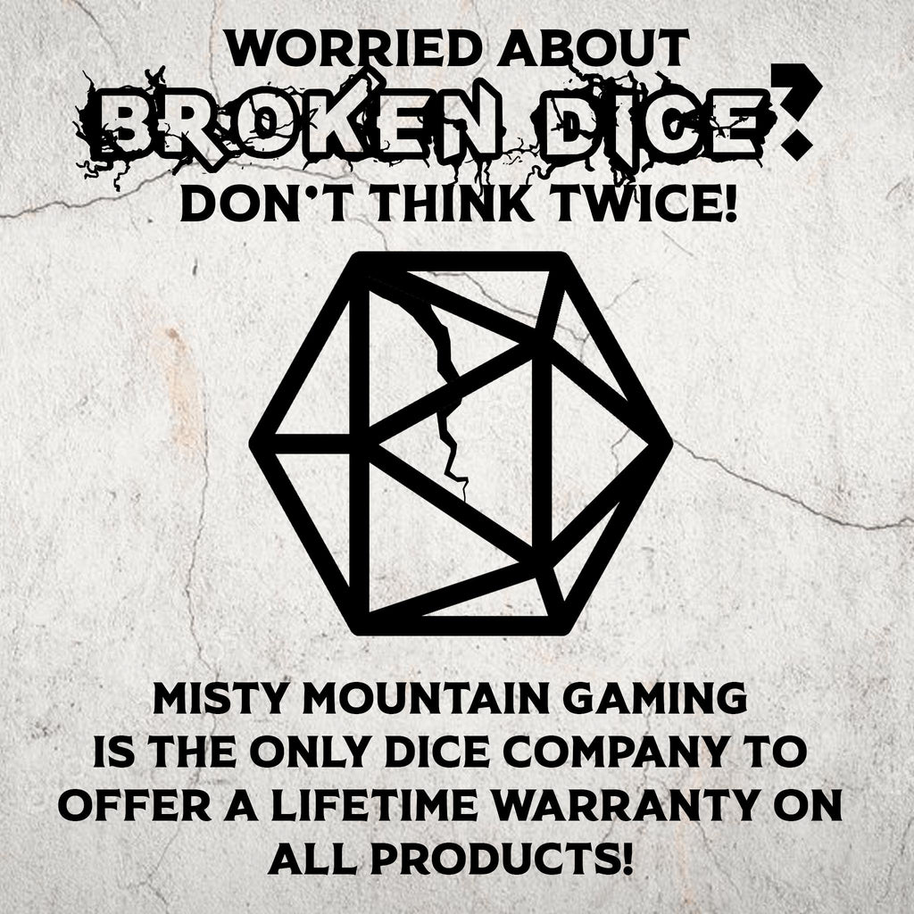 Not satisfied with your dice? No worries! Misty Mountain Gaming offers a 30 day money-back guarantee on all dice!