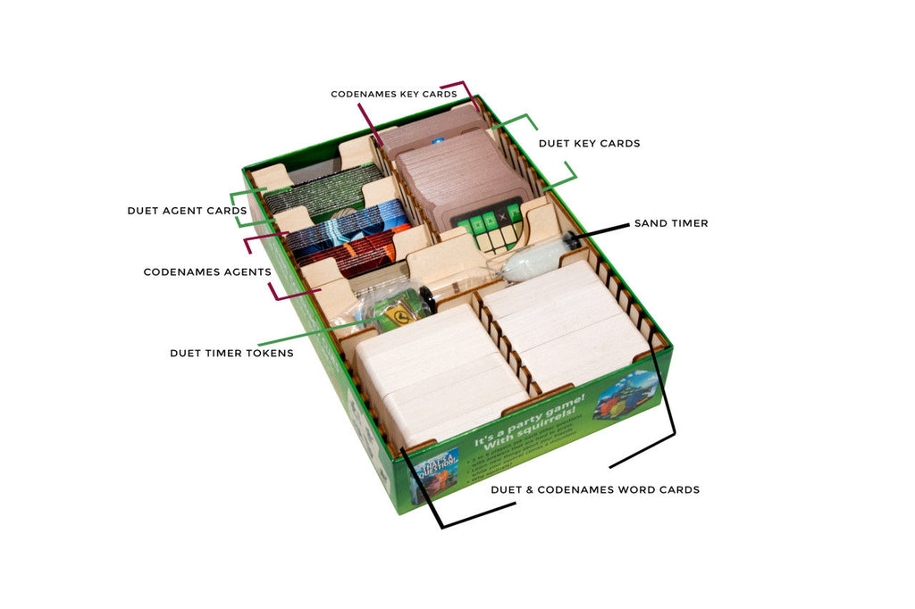Accommodates Codenames Duet (and one additional Codenames game). Note: approximately 0.2" of lid lift with Duet + Pictures.