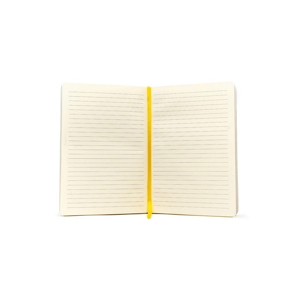 - Matching bright yellow ribbon bookmark and elastic band closure