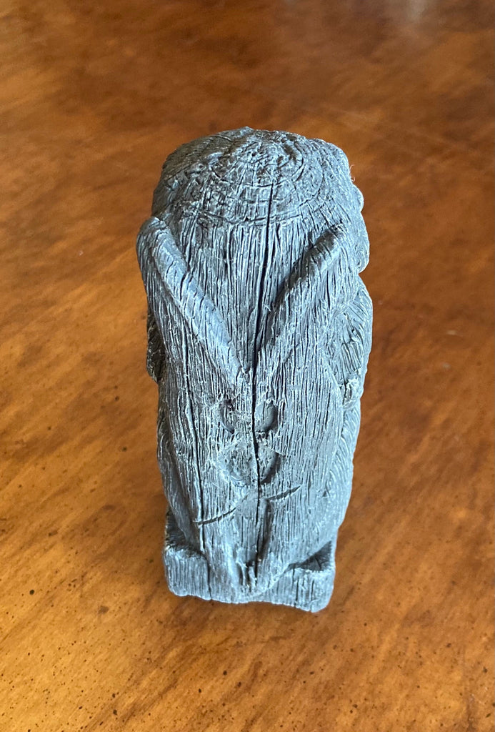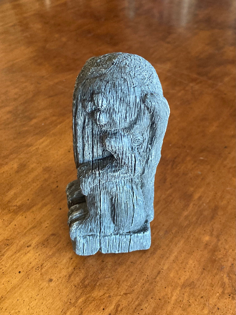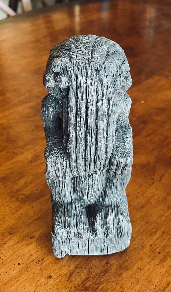 The totem is cast in polyurethane resin but has a convincing heft and aged wood finish to it. It's roughly 4 inches tall by two inches wide and deep. We like this totem a lot and think you'll find a a great addition to your collection.