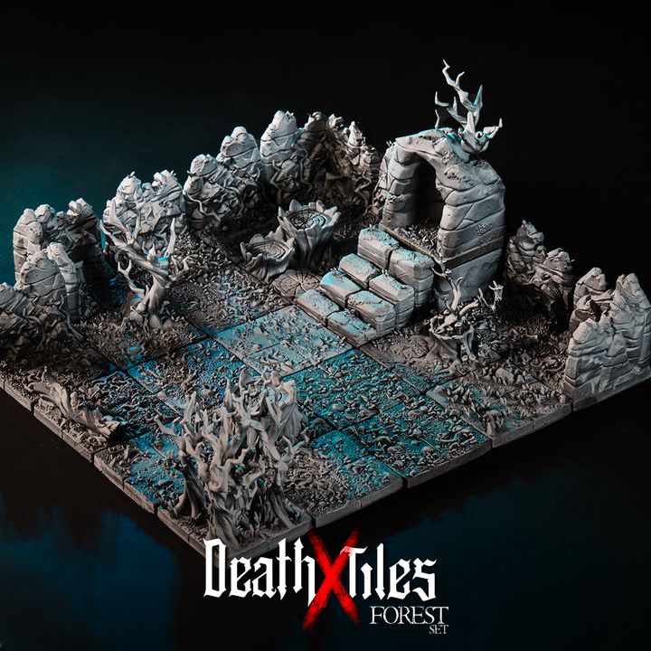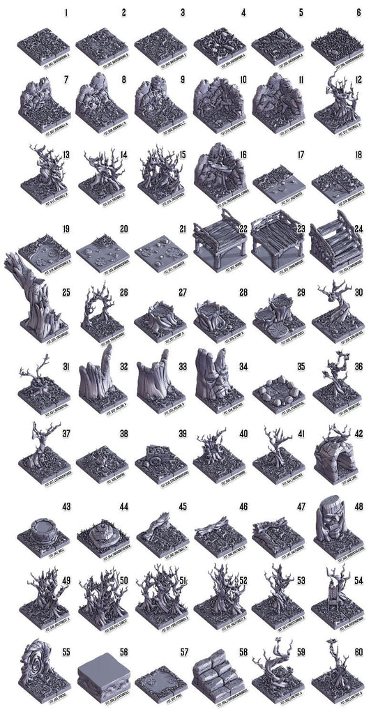 Transform your TTRPG campaigns with the Death X Tiles - Forest Set! Each 60x60mm tile features four 30mm squares, brimming with tangled roots, eerie trees, and crumbled ruins, perfect for games like D&D or Pathfinder. Build haunted woods or ancient pathways that bring your tabletop maps to life!