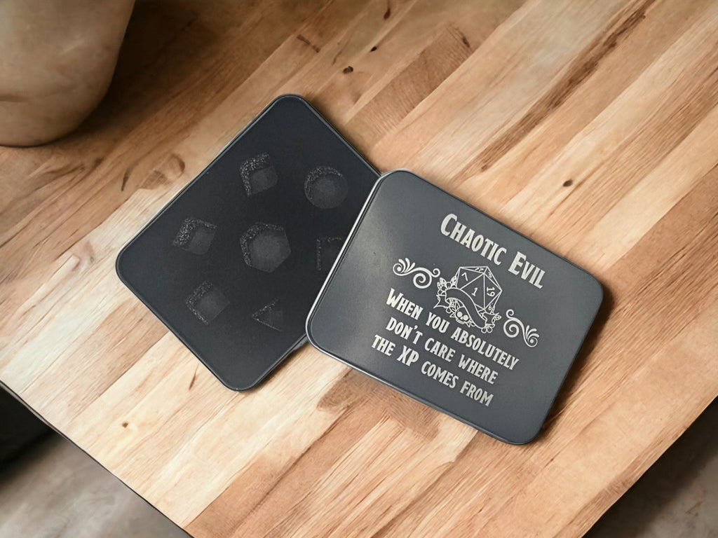 Show off your true alignment—with a twist. This engraved metal dice tin features one of the 9 classic RPG alignments, each paired with a brutally honest or hilariously relatable quote. Whether you're a Lawful Good rules lawyer or a Chaotic Neutral agent of mayhem, there's a lid that captures your tabletop soul.