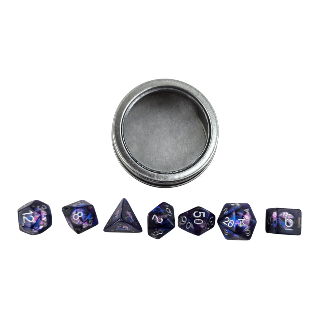 Set of Dragon Eye dice. Clear/blue and purple dice. A blue/ purple and light pink dragon eye in each dice.