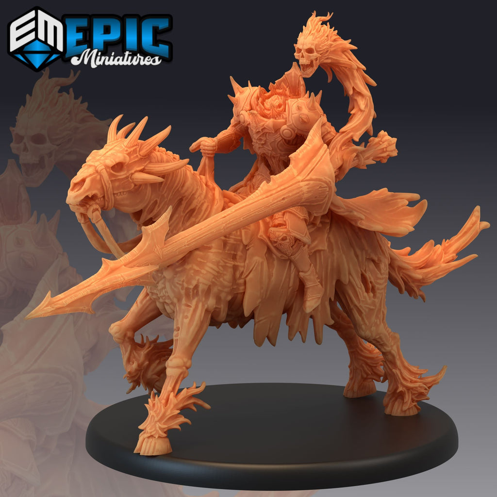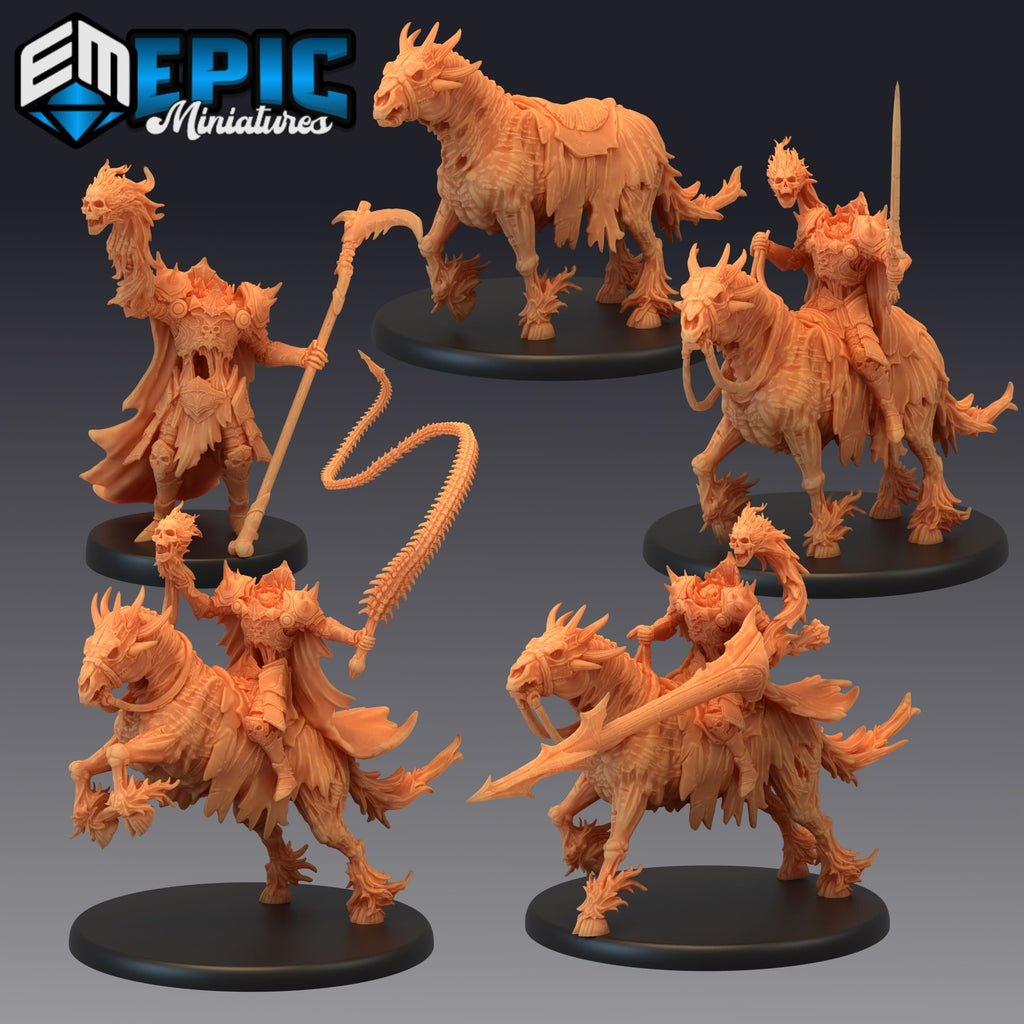 A set of Dullahan Riders, each fearsome and headless, featuring undead mounts and various weapons, including scythes, lances, and whips. These armored spectral knights embody terror, perfect for fantasy TTRPG settings like D&D and Pathfinder. Ideal for immersive tabletop game scenarios and painting.