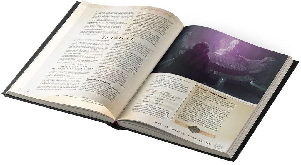 - Guidelines for novice and experienced gamemasters on how to run Dune-themed adventures and campaigns of intrigue and adventure for the elite agents of a noble House.